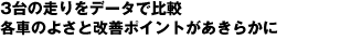 | I&Dはコーナリングがとても安定しているのが印象的ですね。線グラフを見てもらえばわかるのですが、コーナリング中のラインがほとんど乱れていない。これはアクセルを一定に保ったままで走れているということで、とくに最終コーナー(11)でその安定感がハッキリ出ています。これだけ安定したドライビングができればドライバーへの負担も小さくなるわけで、そのへんも今回トップタイムを出した要因のひとつだと思いますよ。つぎにラスティーですが、クルマ全体のレベルとしては、I&Dとくらべてもそん色ないですね。あえて言うなら、1コーナー(3)でアクセルを踏み込むタイミングが遅れていること。線グラフを比較してみると、I&Dよりもスピードが落ちているのがわかると思います。ちなみに、最終コーナー(11)でのアクセルワークが乱れているのは、たぶん前のクルマを抜くためにアクセルのオンオフを繰り返したからでしょう。タラレバの話になってしまいますが、ほかの部分でI&Dと大きな差がなかっただけに、オールクリアだったらひょっとしたかもしれませんね。そして最後にカザマオート。コーナリングスピードは、2台に遅れを取っていますね。ストリートでの乗り味も考えた足まわりということで、踏ん張りがきかないのでしょう。でも、コーナー立ち上がりからトップスピードに達するまでの加速力は、すばらしいと思います。たとえば2ヘア(8)をまわっているときの速度はいちばん遅いのですが、裏ストレートでの最高速(10)はトップになっている。それだけ低回転からの伸びがいいってことでしょうね。エンジン特性としては、いちばん筑波にあっていると思いますよ。(V‐BOX・中野) | ||