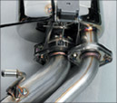 70φのメインパイプがタイコに入る直前でふたつに分岐しているのが特徴。排気の流れをコントロールするこの仕組みで、排気効率&音量がずいぶん変わってくる。タイコのサイズが大きいぶん、パワーゲッターと比べると、パイピングの曲がりはチョットきつめとなっているのだ。 | ![]() |
