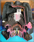 エンジンブロックのウォータージャケット内に挿入する樹脂製のスペーサー。ウォータージャケットは水の流れが悪く、どうしても均一な温度になりにくいのが難点なんだけど、これを入れるとシリンダーの均等な冷却が可能になる。均等に冷却されたシリンダーは、部分的な熱膨張もなく安定したクリアランスになるから、ピストンとの摩擦が減って燃費が向上するそうだ。チューニングカーならパワーアップ確実か!? |