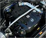 排気系で大きくパワーロスしているといわれるVQ35。そのため、エンジン本体はカム&バルブスプリングのみ交換というメニューながら、エキマニもふくめた排気チューンが効果を発揮し、ボッシュのシャシダイでは330psをマークしている。 |