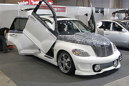 「世界一のPTクルーザー」をコンセプトに、ランボドアやカスタムペイントといったメニューはもちろん、ビジュアル&サウンド面も徹底的に作り込まれたPTクルーザー。ダッシュボード部分は大幅に作り替ええられ、15インチモニターをセンターにレイアウトしつつ、メーターはオートメーターとデフィで一新。オーディオ部分はアルパインとインポートブランドのダイヤモンドオーディオを組み合わせ、10つのスピーカーと4つのサブウーファーで大迫力サウンドを展開する。