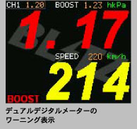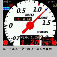 | あらかじめワーニング値を設定しておけば、警告音とともに文字色が赤くなって危険を知らせてくれる。また、ピーク値表示も可能で、ニードルメーターではワーニング値を赤、ピーク値を青のマークで表示。色わけできるのもカラーならではだよね。 | ![]() ![]() |