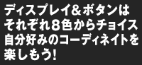 ディスプレイとボタンカラーの組み合わせは64通り。オーディオなどのスイッチ類や、純正または追加メーターに合わせたり、自分好みのカラーコーディネートを楽しめるのも魅力のひとつだ。 |