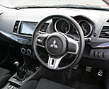 インパネの基本デザインはベースになっている「ギャラン フォルティス」と共通だが、メーター、ステアリングホイール、加飾パネルなどはエボ専用品。ステアリングホイールは365Øで、ステアリングをまわす際の引っかかりをなくす凹凸のないステッチを採用している。 | ![]() |