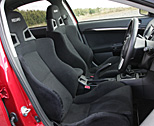 RECARO製のバケットシートは、全車標準装備。市販品の「SR-11」をベースにして骨格の大部分を共用しているが、パッドやサイドサポートの形状はランエボ用の専用設計になっている。メーカーオプションでは、一部をレザー張りにした仕様も選択可能だ。 | ![]() |