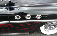 この賞はKING of Super American Festival。つまりその年一番の賞。毎年、色々な傾向でこの賞を決めているんだけど、まずはこの時代のトレンドセットができているかというのが基本で、レトロテックならなおよしって感じだ。レトロテックってのは、俺が作った造語なんだけど「見た目はレトロのままなのに中身は最新」というように、例えばインジェクションをつっこんだり、クーラー入れたりして快適仕様になっているクルマのこと。そういう意味ではこのビュイックは少し残念だけど、最終的な決め手はIKURAさん自身が今、乗りたいか?っていうことだからOK。このクルマは53年のビュイック50周年記念車。OGパーツでキレイにしているし、原型がきちっと残っている。ビュイックは49年から付いているフェンダー側面の列孔(ボートホールズ)が最高にカッコイイ。元々のエンジンは322CIのV型8気筒OHVなんだけど、きちっと350に載せ替えているのも高ポイントだね。